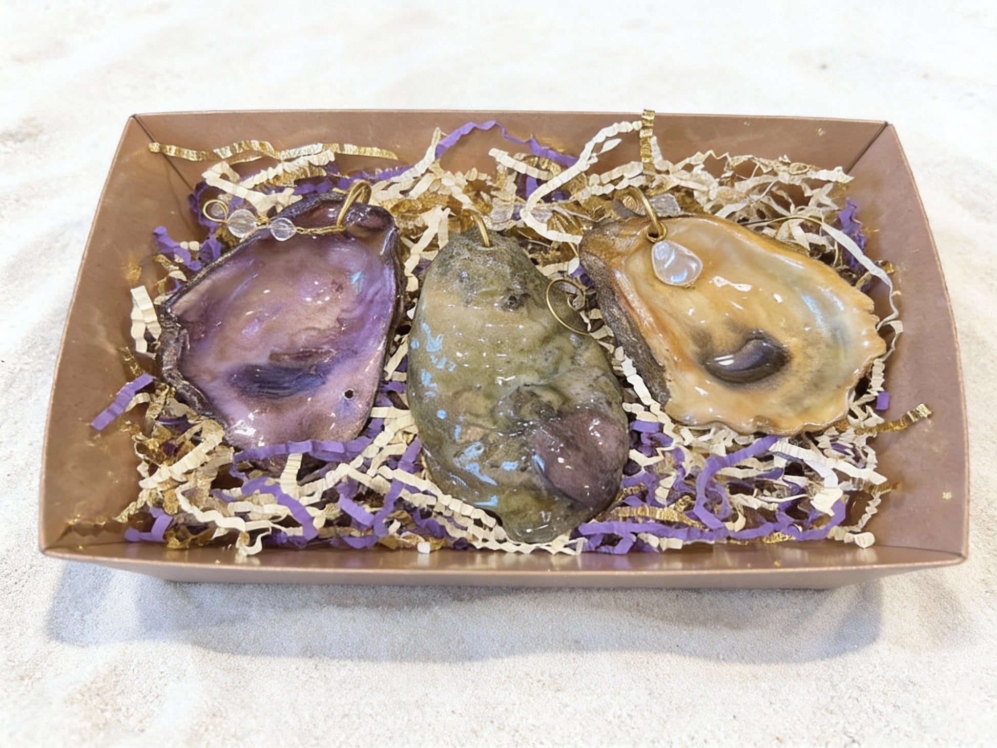 INSPIRED BY THE MAGICAL PATINA ON NATURALLY AGED OYSTER SHELLS, GATHERED ONE BY ONE FOR CHARACTER FROM MOBILE BAY. INDIVIDUALLY HAND PAINTED FOR THE GLINT OF MARDI GRAS, DIPPED IN HARD EPOXY RESIN FOR LONGEVITY AND QUALITY. FINISHED FOR GIFTING WITH DECORATIVE HOOKS AND A GIFT BOX.