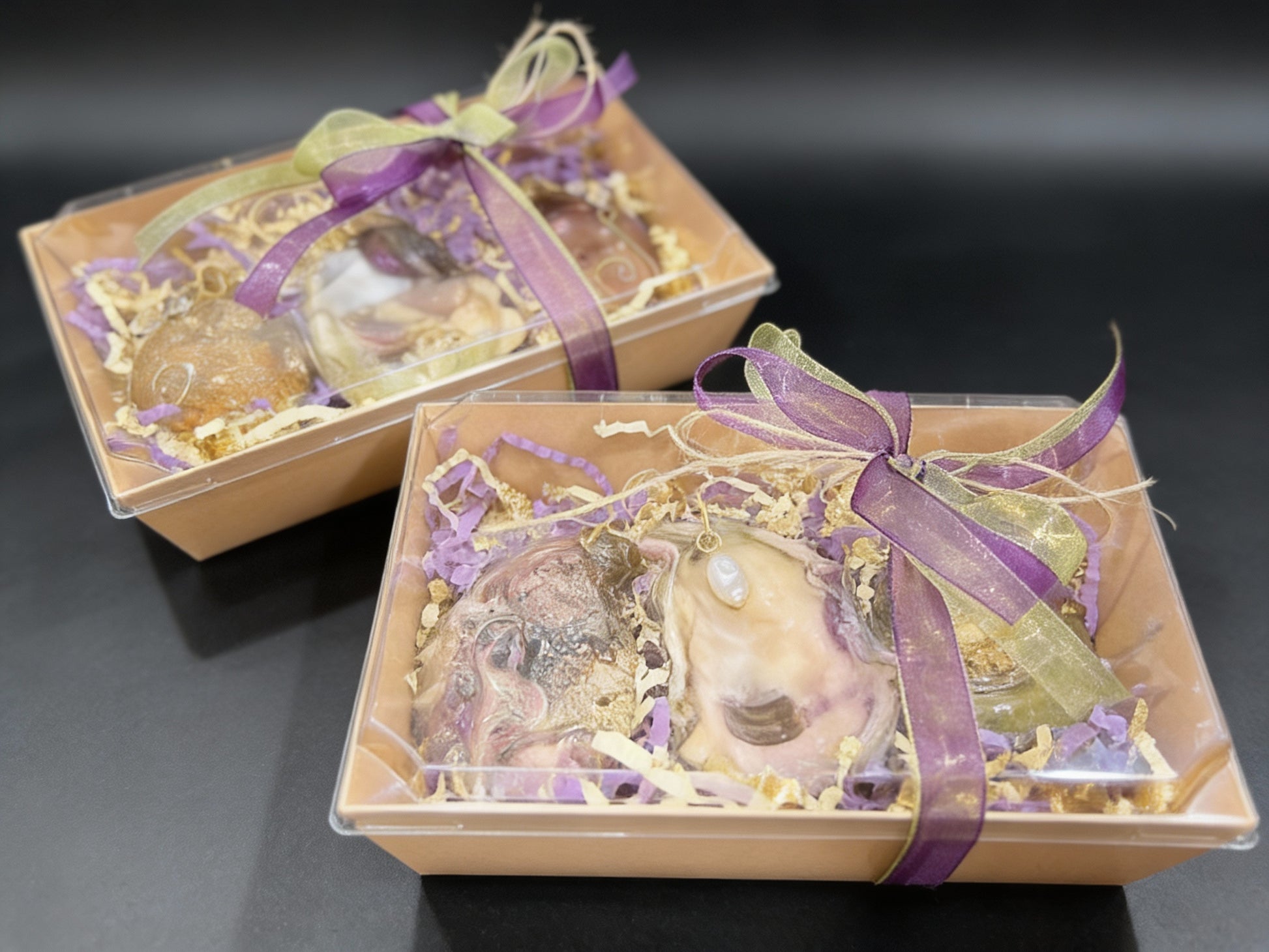 INSPIRED BY THE MAGICAL PATINA ON NATURALLY AGED OYSTER SHELLS, GATHERED ONE BY ONE FOR CHARACTER FROM MOBILE BAY. INDIVIDUALLY HAND PAINTED FOR THE GLINT OF MARDI GRAS, DIPPED IN HARD EPOXY RESIN FOR LONGEVITY AND QUALITY. FINISHED FOR GIFTING WITH DECORATIVE HOOKS AND A GIFT BOX.